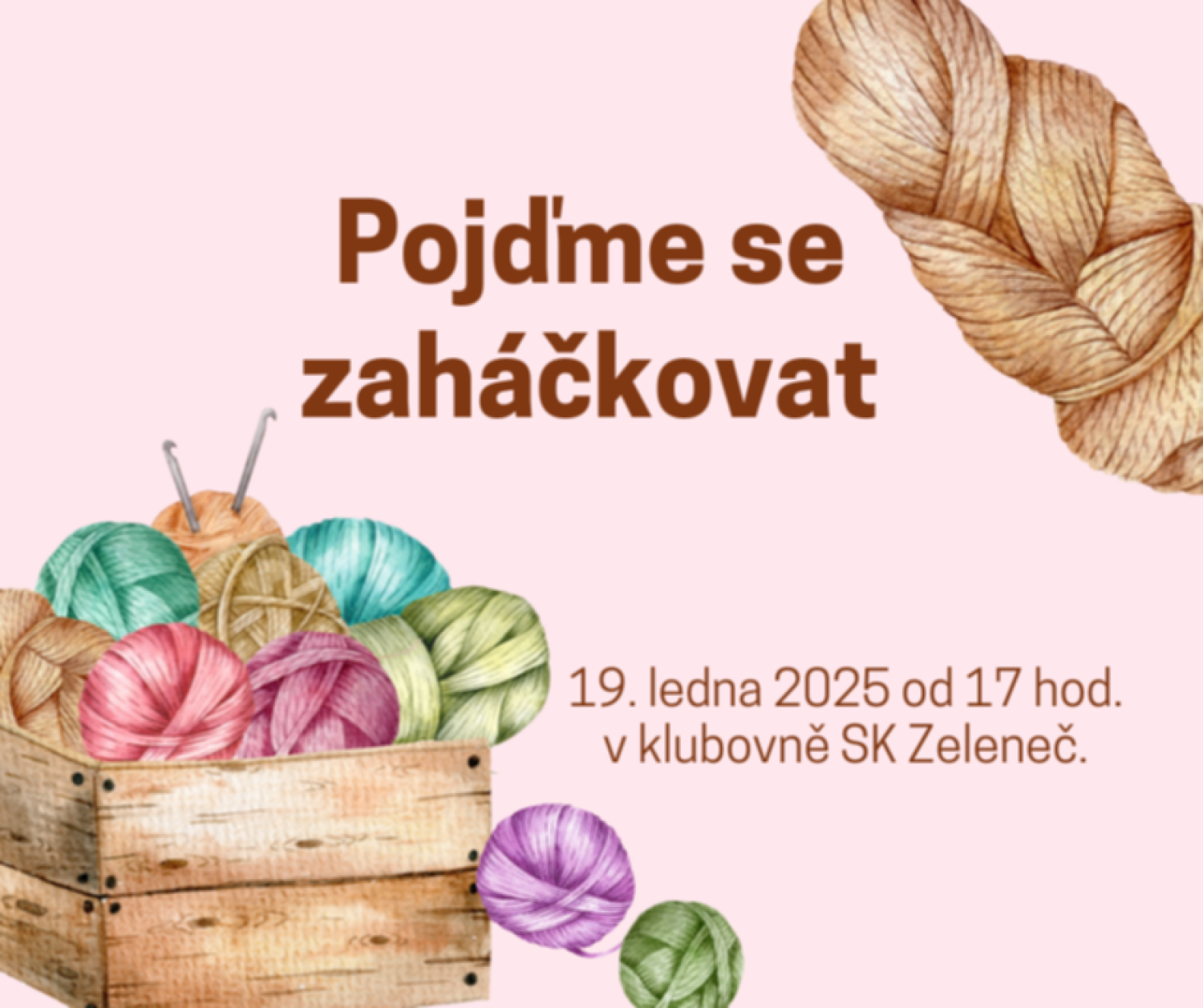 Materiál na háčkování bude k dispozici na místě. Registrace předem není nutná, ale v případě dotazů pište tady na Facebook nebo na email akce@zelenec.cz.