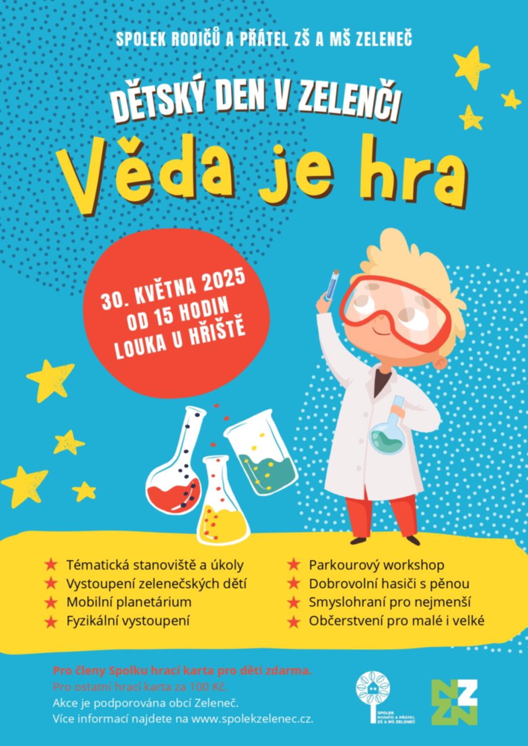 Spolek rodičů a přátel ZŠ a MŠ Zeleneč vás zve na Dětský den v Zelenčci, tentokrát na téma VĚDA JE HRA.