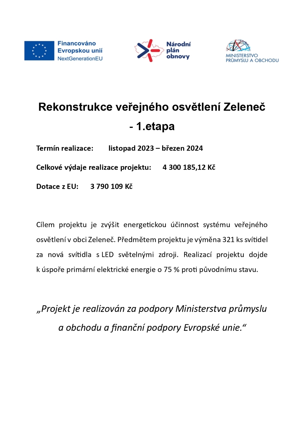 Elektrická energie spotřebovaná pro provoz veřejného osvětlení nás každoročně stojí více než 1 milion korun. Proto jsme připravili projekt na výměnu zdrojů lamp za moderní LED technologii, která bude znamenat úsporu energie až 75 %, zároveň umožní regulaci intenzity světla především v nočních hodinách. Abychom mohli využít dotační titul Ministerstva životního prostředí, bylo třeba splnění mnoha podmínek, např. vyhotovění pasportu veřejného osvětlení.